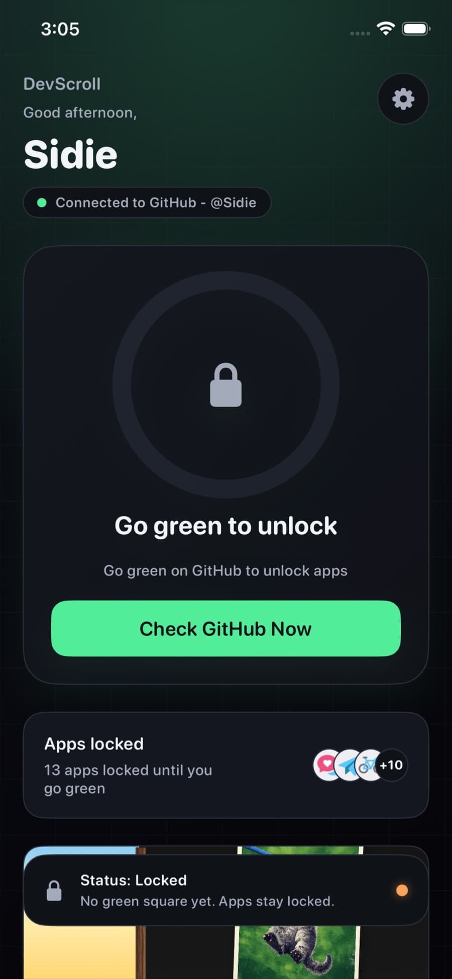Turn your GitHub commits into phone unlock streaks. Push code daily to keep your apps accessible — a playful productivity lock for developers.