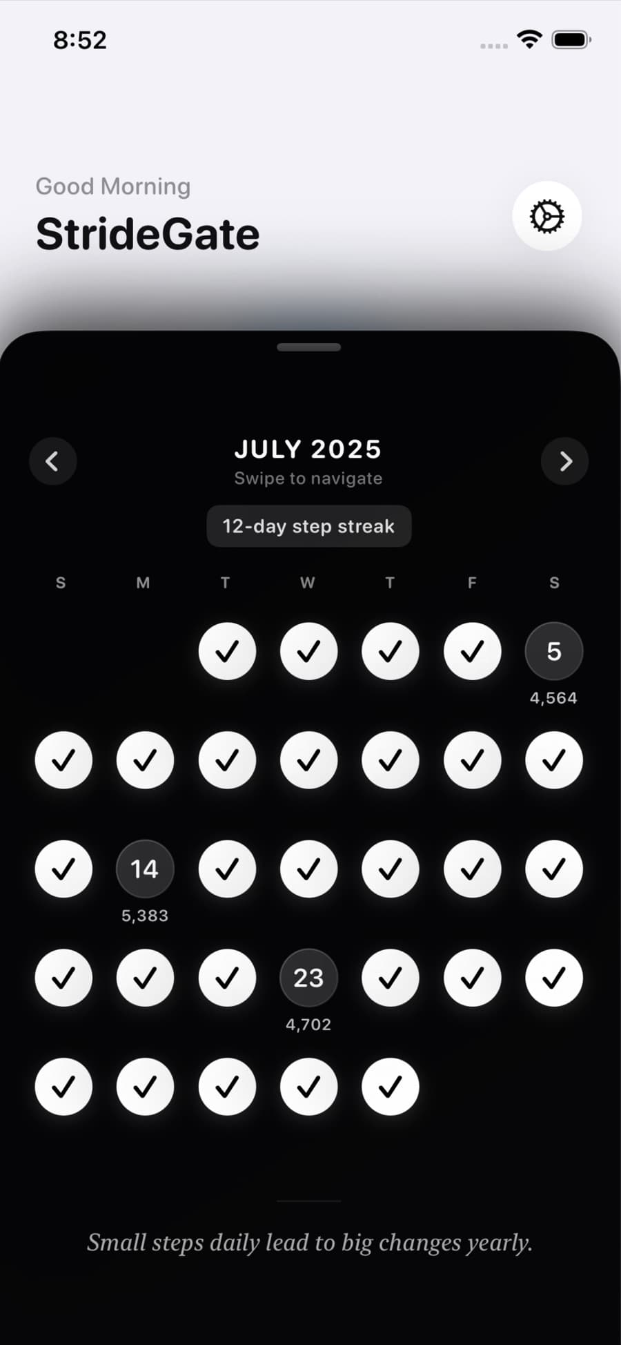 Your phone stays locked until you walk. Hit your step goal to unlock your favorite apps — gamified movement that builds real habits.